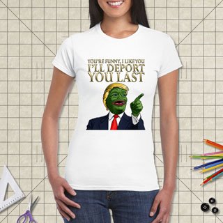 $24.99We love immigrants of the legal variety that have something to add to our glorious nation - but those who sneak in to rape our welfare system, commit crimes and sell drugs can GTFO! Show your spiciness with this hilarious Pepe Trump shirt! Available in Black, White and Purple.