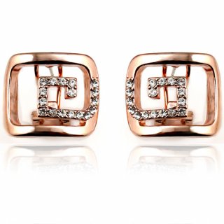 $25.00Thick plated 18k Rose Gold bands adorn these geometrically shaped earrings. A band of impeccably placed glistening man-made diamonds enhance the sheer artistry of the design! 1.5 x 1.8 cm