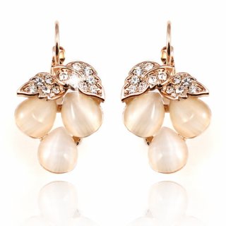 $30.00Shaped from plated 18k Rose Gold, these earrings feature a bunch of hanging fruit Rose Gold Opals with man-made diamond encrusted petals. Express your individuality with these truly unique earrings! 1.7 x 3 cm