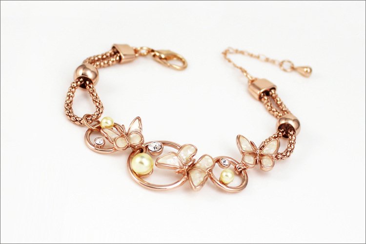 What a simply fun and charming bracelet! Seashell butterflies dance around dazzling gemstones and dashing pearls while a uniquely designed 'rope' 18k Rose Gold plated chain holds the piece together. Perfect with any outfit!