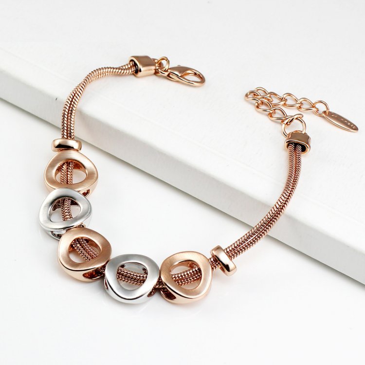 'O'-so-elegant! This classy contemporary bracelet comprises of a 18cm 18k Rose Gold plated dual-rope chain, completed to perfection with 18k Rose Gold and 18k White Gold accented Os.