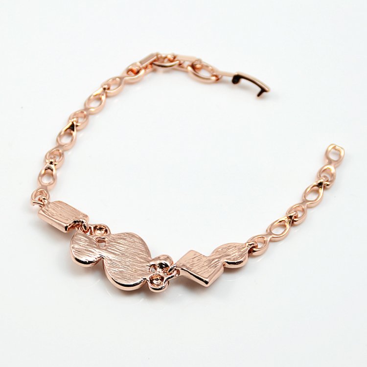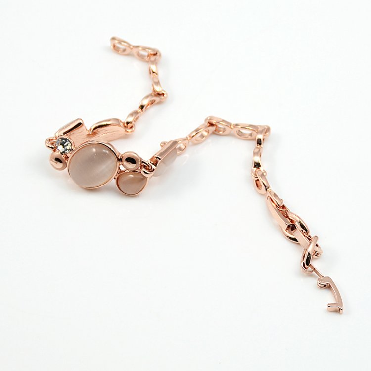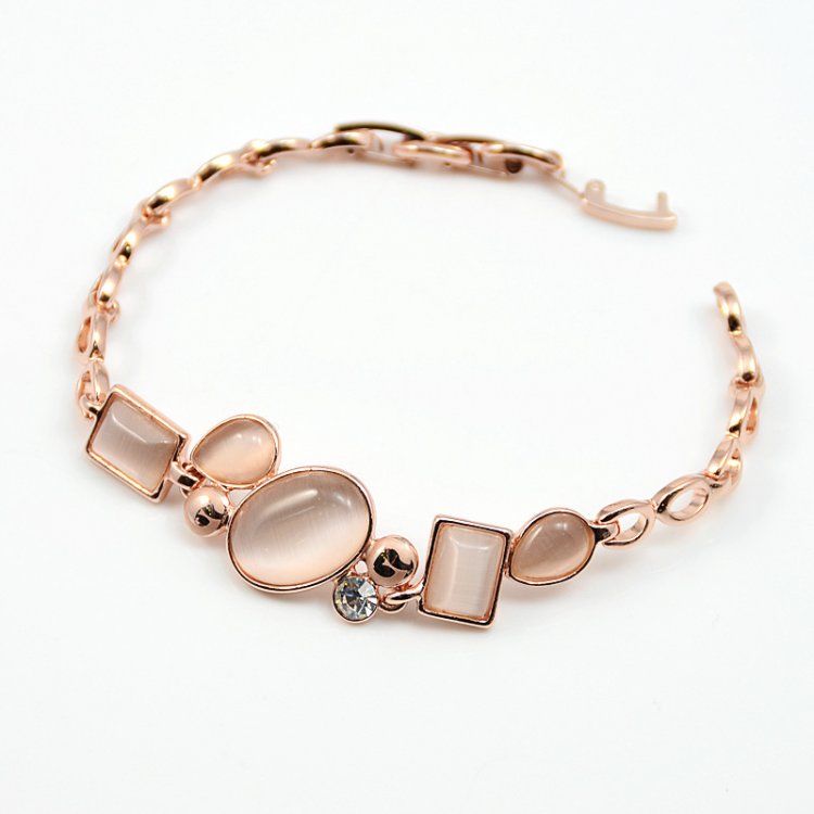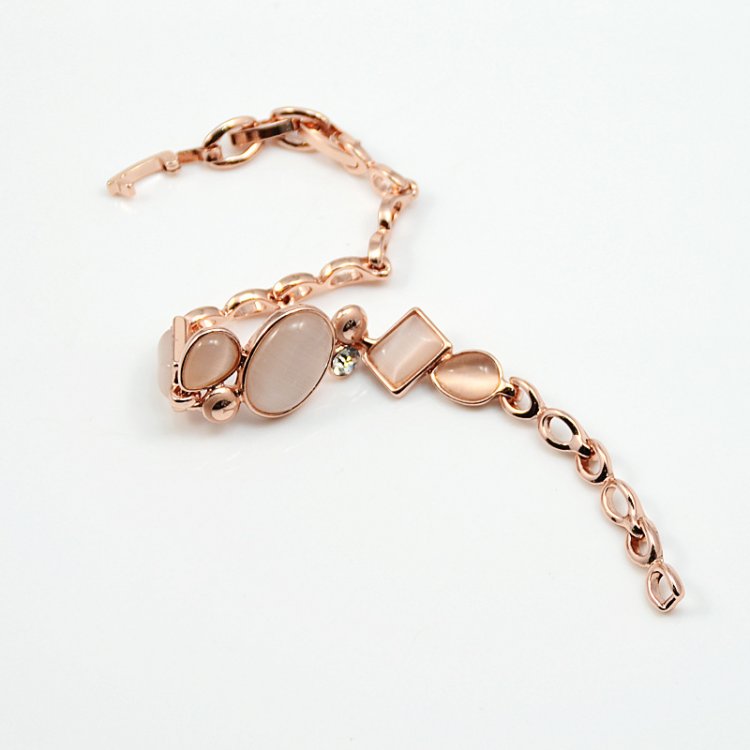 An 18cm 18k Rose Gold chain holds a variety of magnificent oval, rectangular, diamond and rectangular Rose-Gold or Deep-Rose Rhinestones which are accentuated by a man-made cat's-eye diamond.