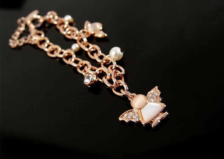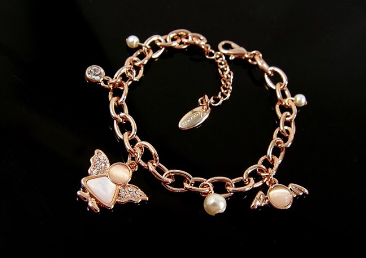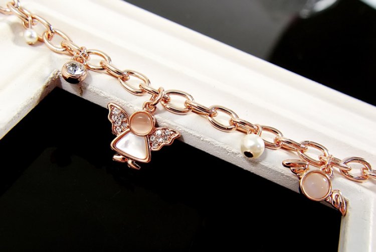 Cute to the max! A radiant angel donned with glistening man-made diamonds, soft supple shells and stones hangs from an intricate 18k Rose Gold plated 17cm chain (4.5cm extension). Accompanying the blissful Angel are sparkling cat's eyes diamonds and milky smooth pearls.