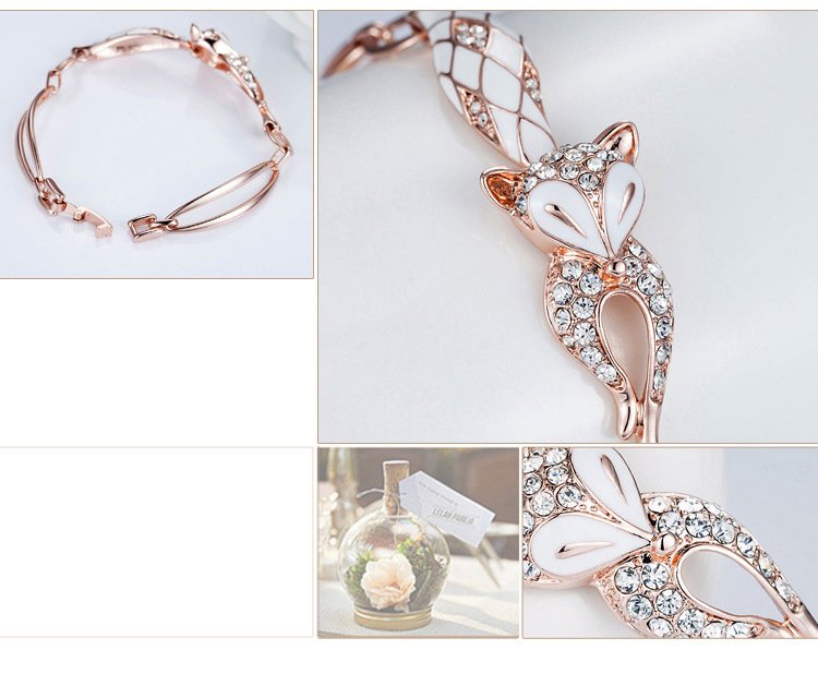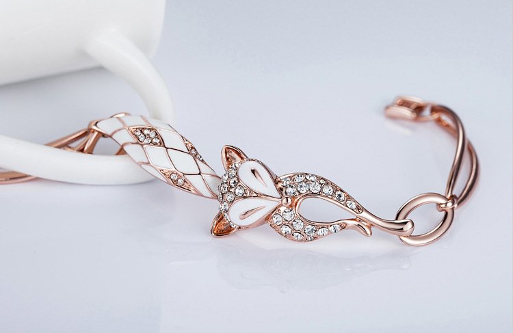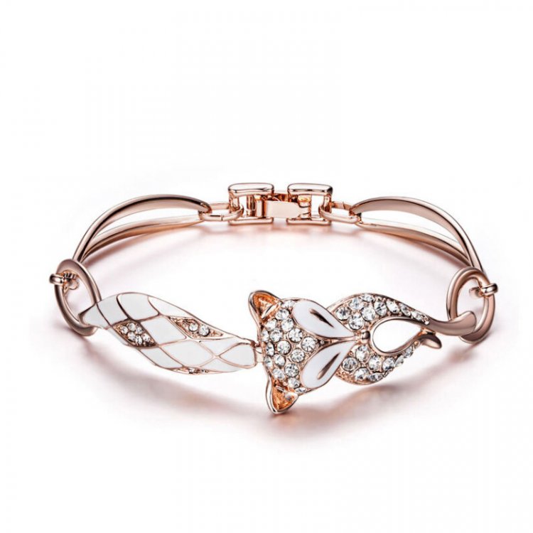 Fashionably forged from 18k plated Rose Gold, a lustrous fox encrusted with man made diamonds wanders around your wrist in elegance. Chain length 17cm. Match with the Elegant Fox Ring to pull your look together!