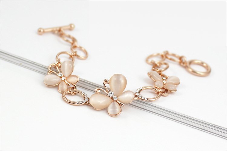 What a simply elegant and classy bracelet! Creamy Rose Gold Rhinestone butterflies flutter around dazzling man-made diamonds while a uniquely designed 18cm long 18k Rose Gold plated chain holds the piece together. Perfect with any outfit!