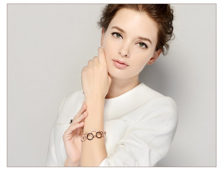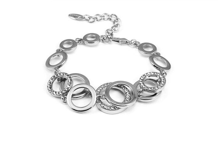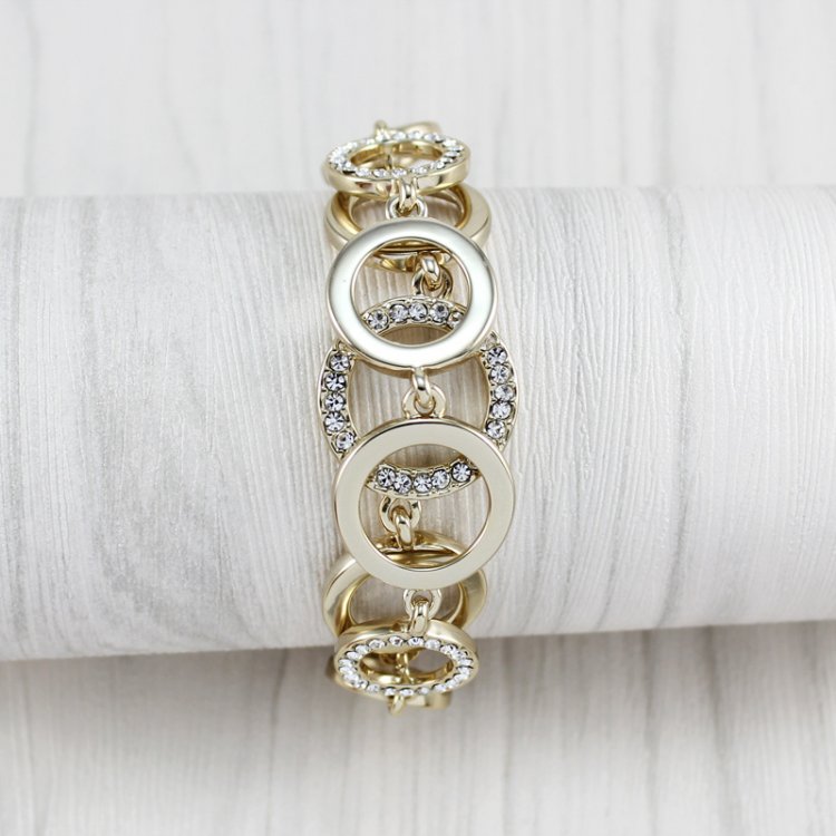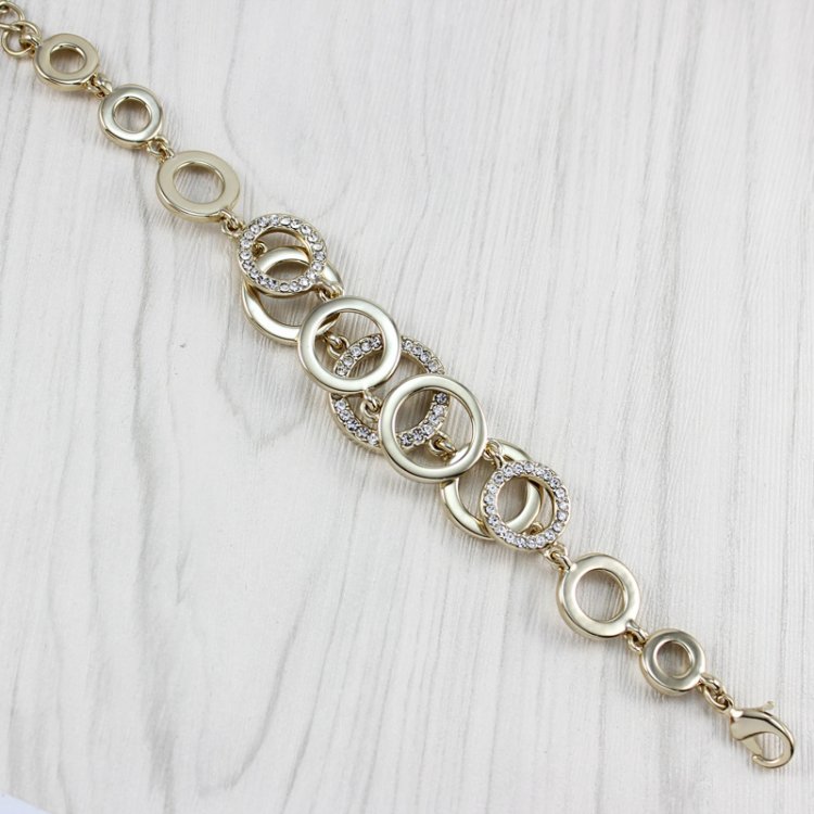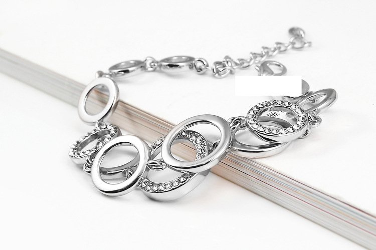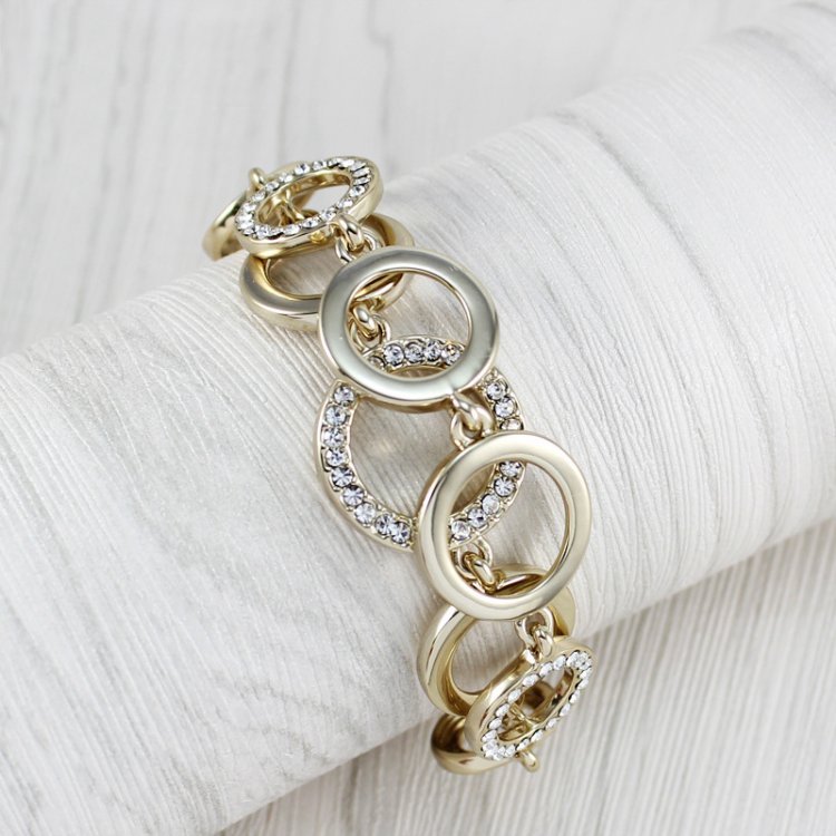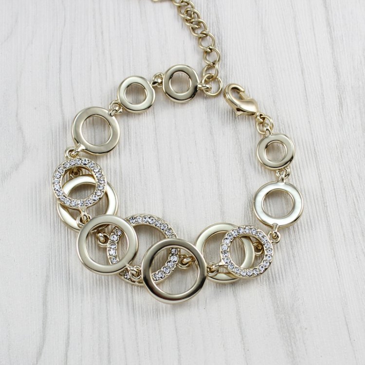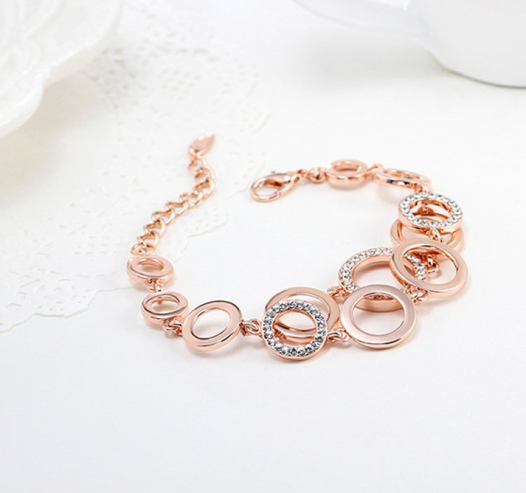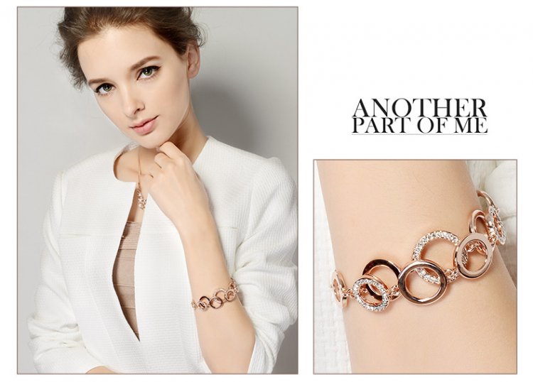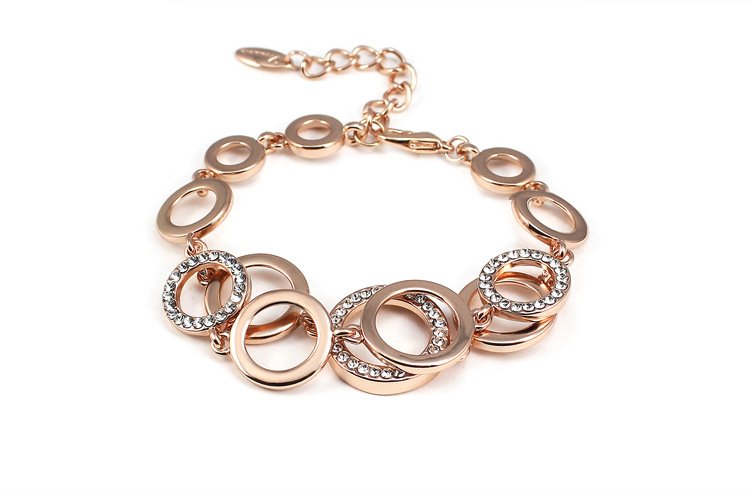 A bundle of 18k (plated) Gold, Rose Gold or White Gold rings wrap elegantly around this piece. Five prominent rings are bejewelled with an immaculate placement of man-made diamonds. 22cm total length and 2cm height