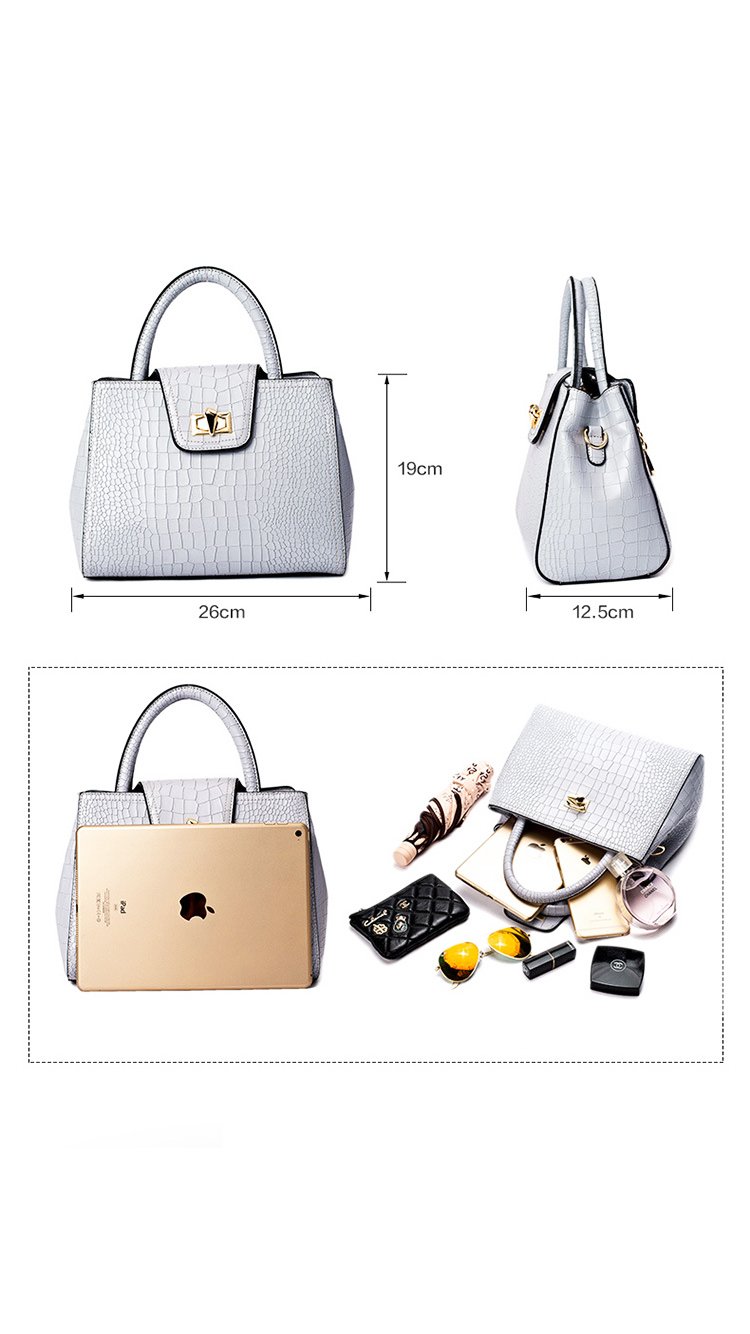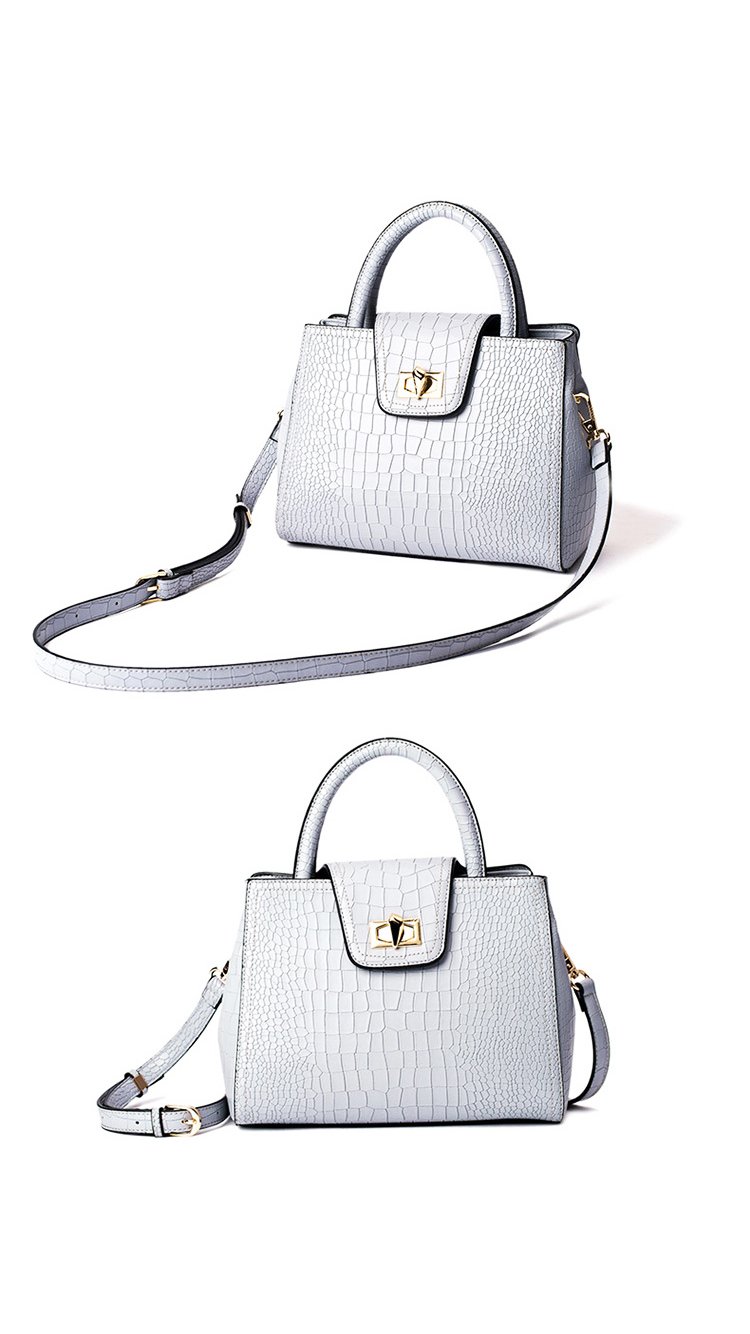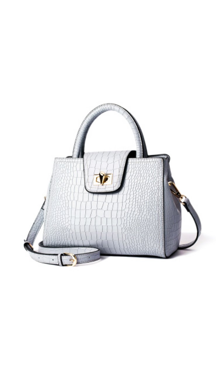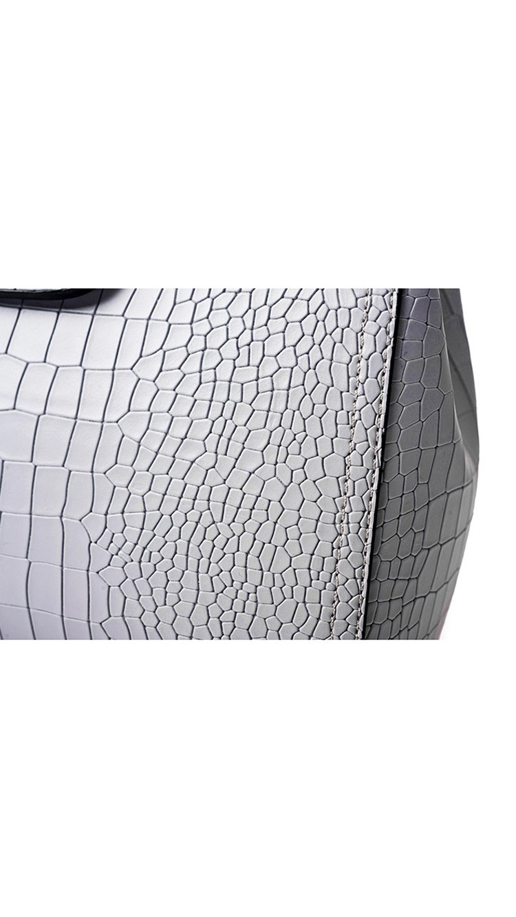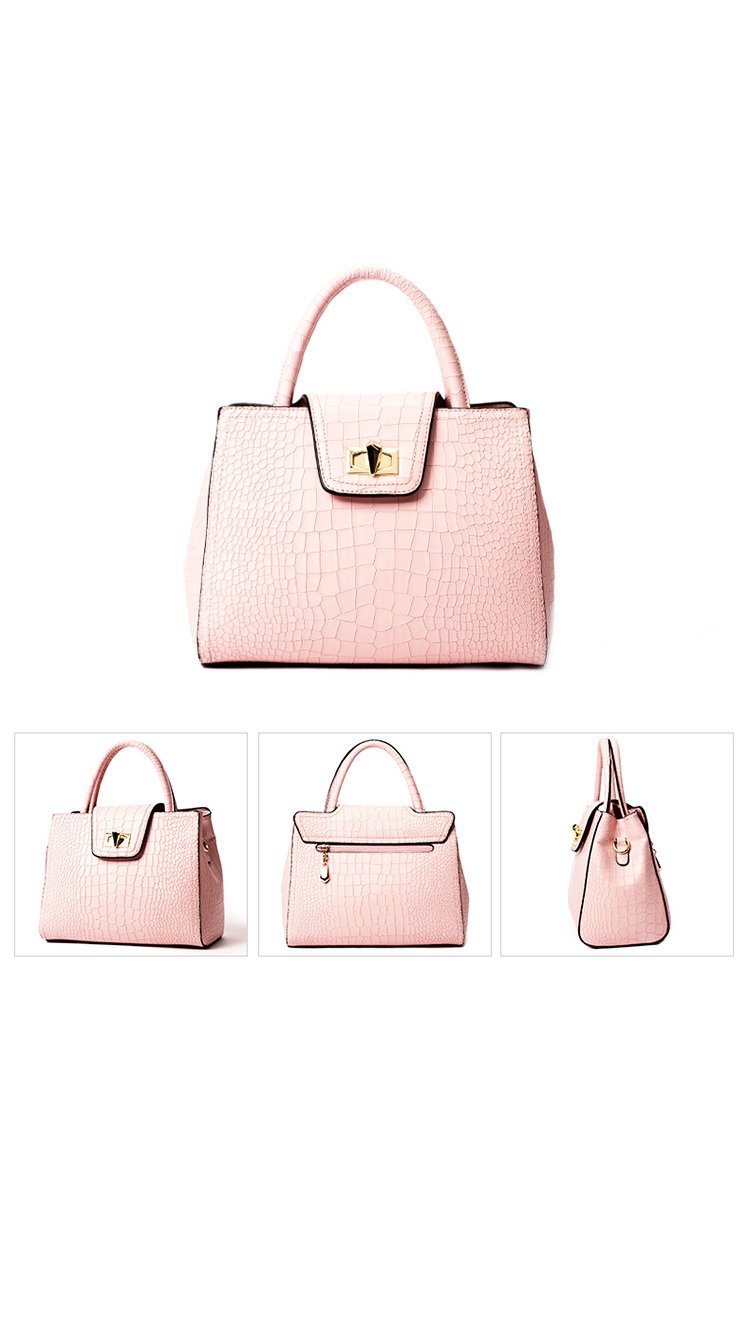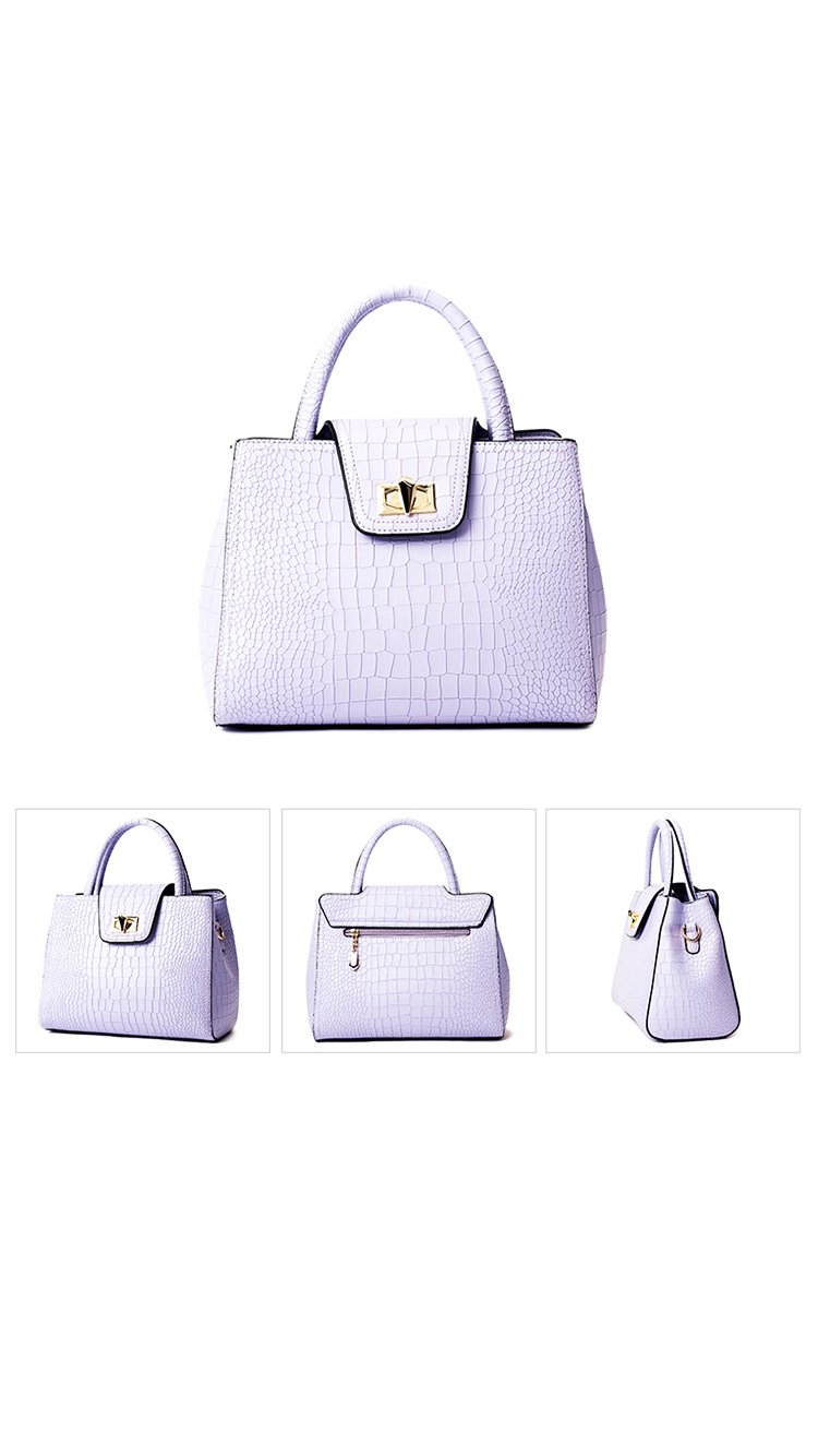 Constructed of durable and easy to care for split leather, this purse is embossed with a stunning croc print. The carrying handles are thick and supported by shimmering all metal hardware. The adjustable shoulder strap is ideal for cross-carrying and can be adapted to provide the perfect fit. Available in seductive pink and playful purple. 26cm x 19cm x 12.5cm