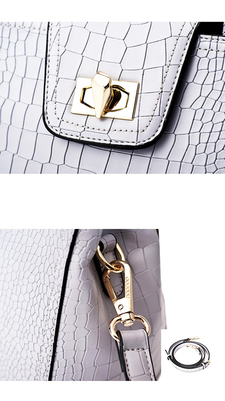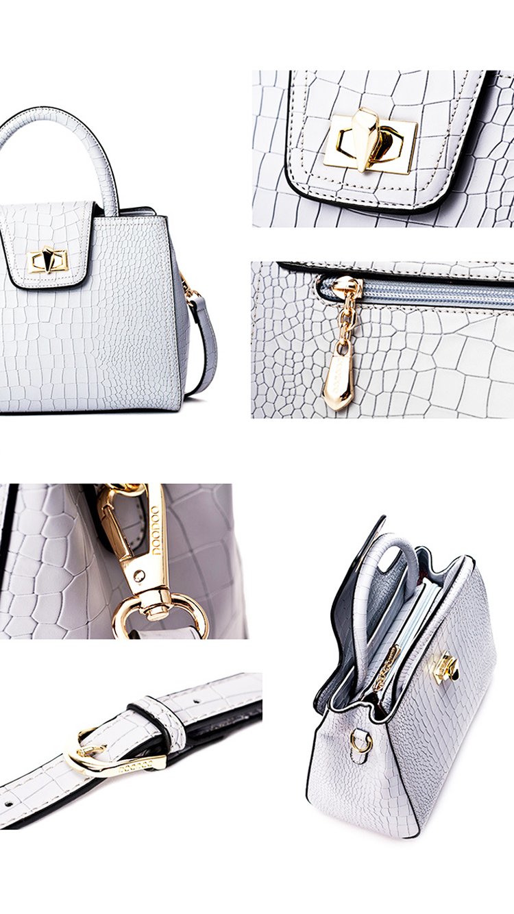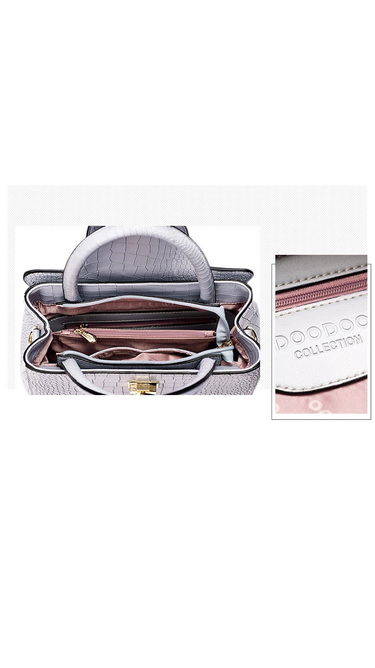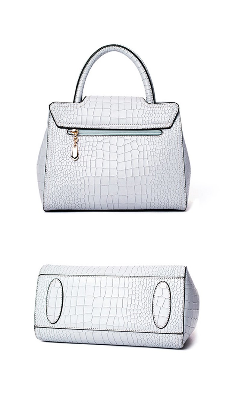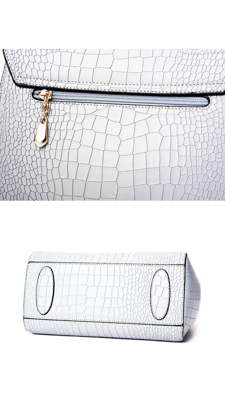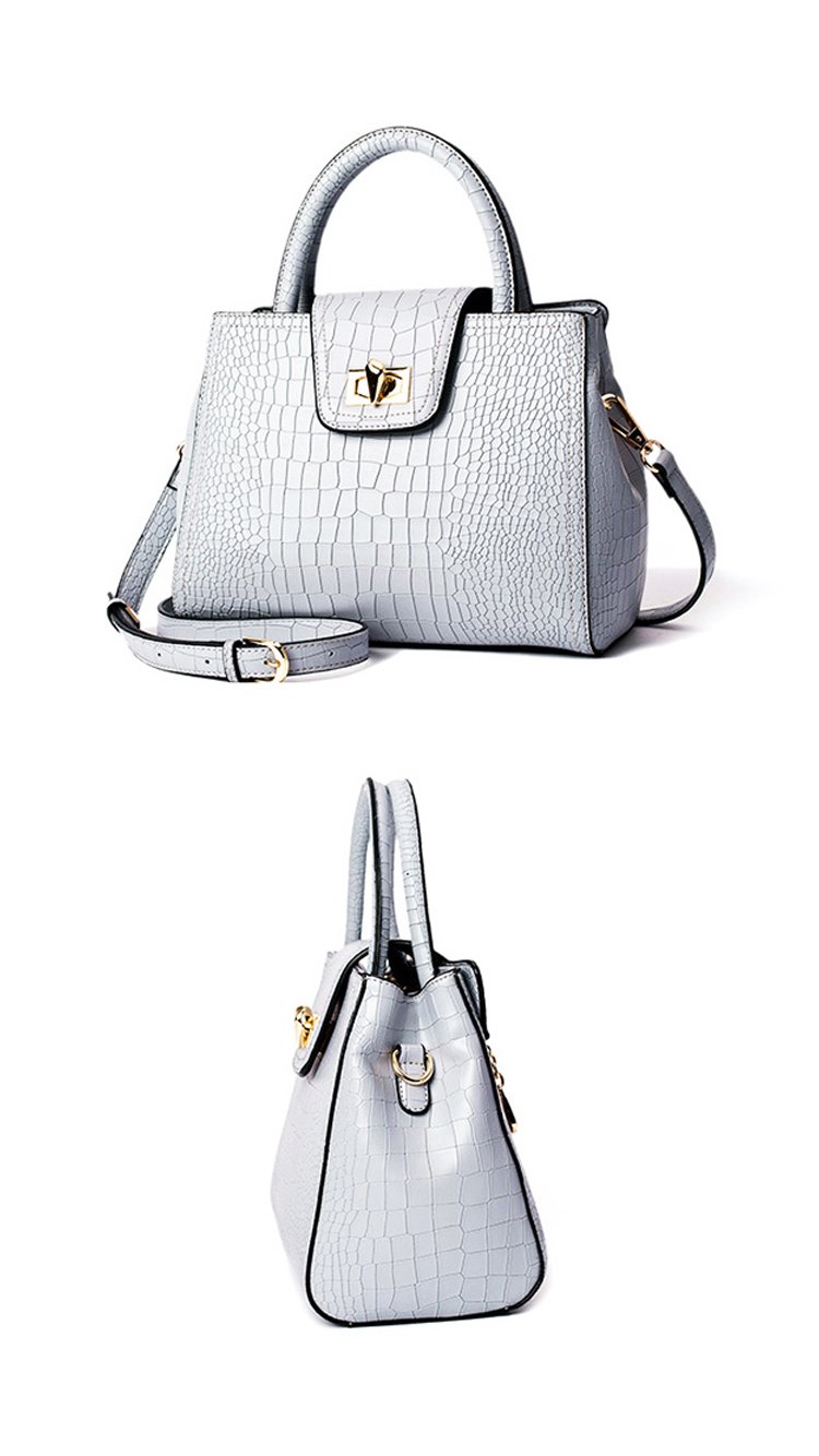 Constructed of durable and easy to care for split leather, this purse is embossed with a stunning croc print. The carrying handles are thick and supported by shimmering all metal hardware. The adjustable shoulder strap is ideal for cross-carrying and can be adapted to provide the perfect fit. Available in seductive pink and playful purple. 26cm x 19cm x 12.5cm