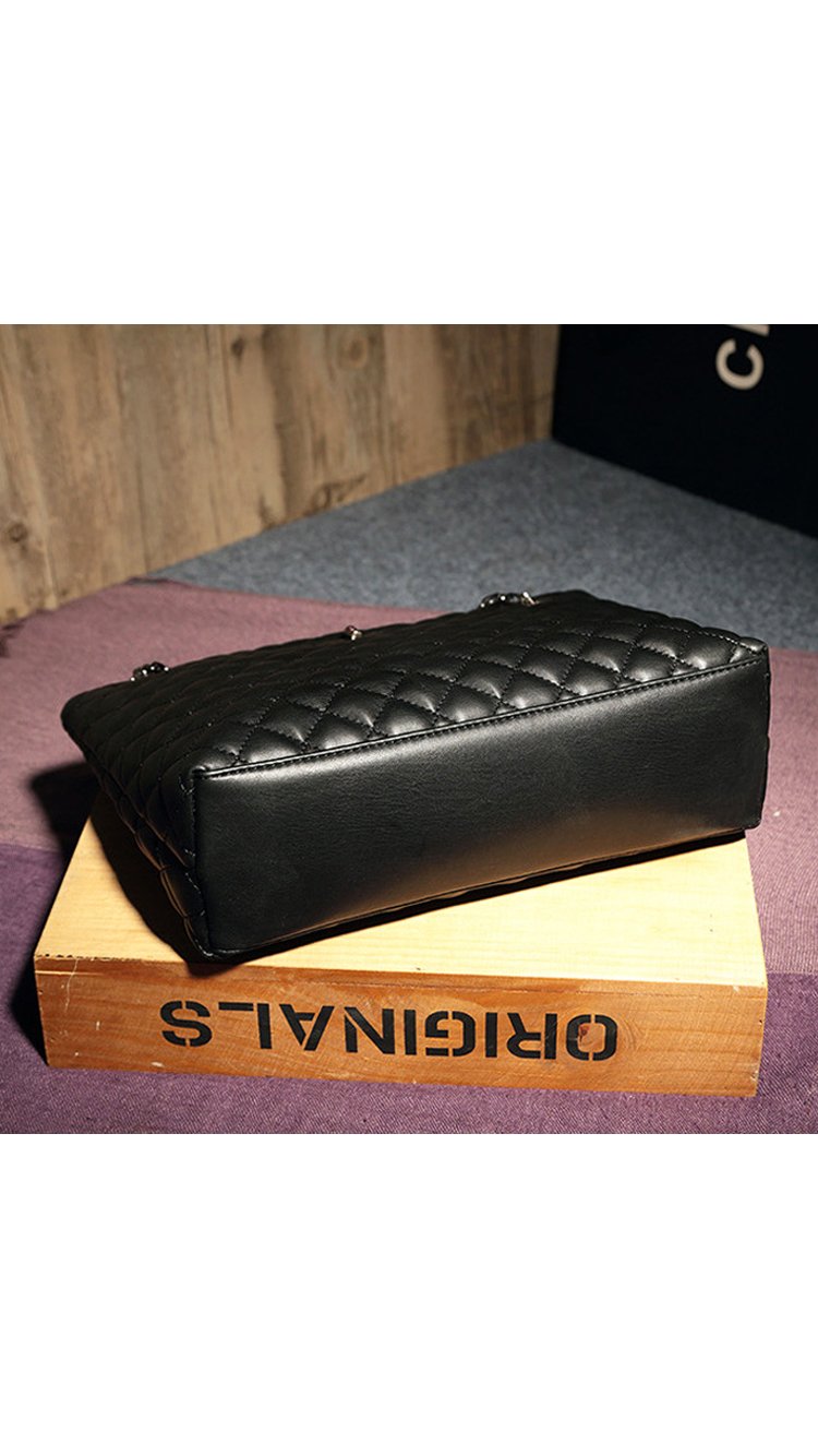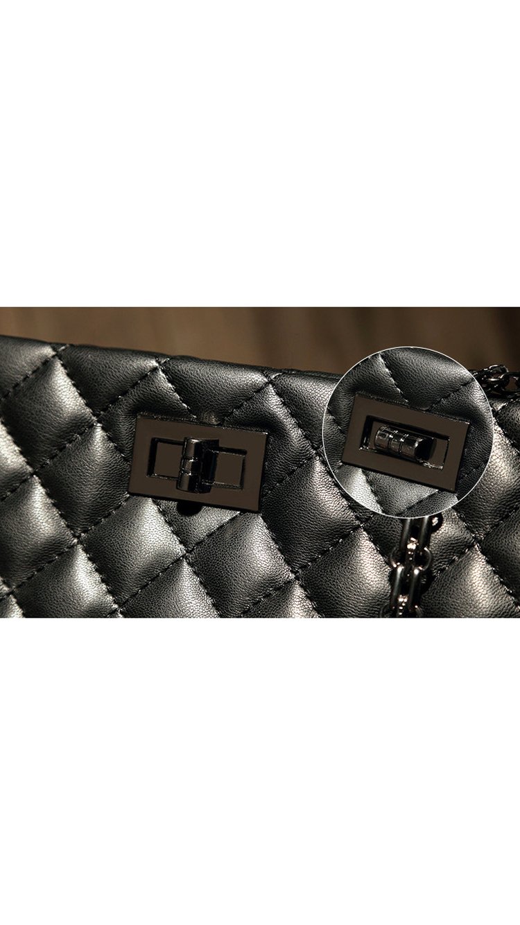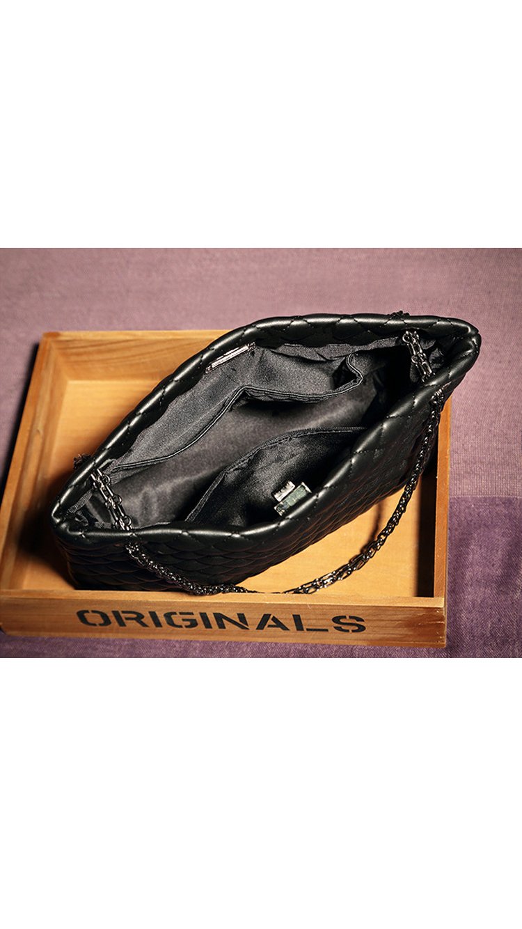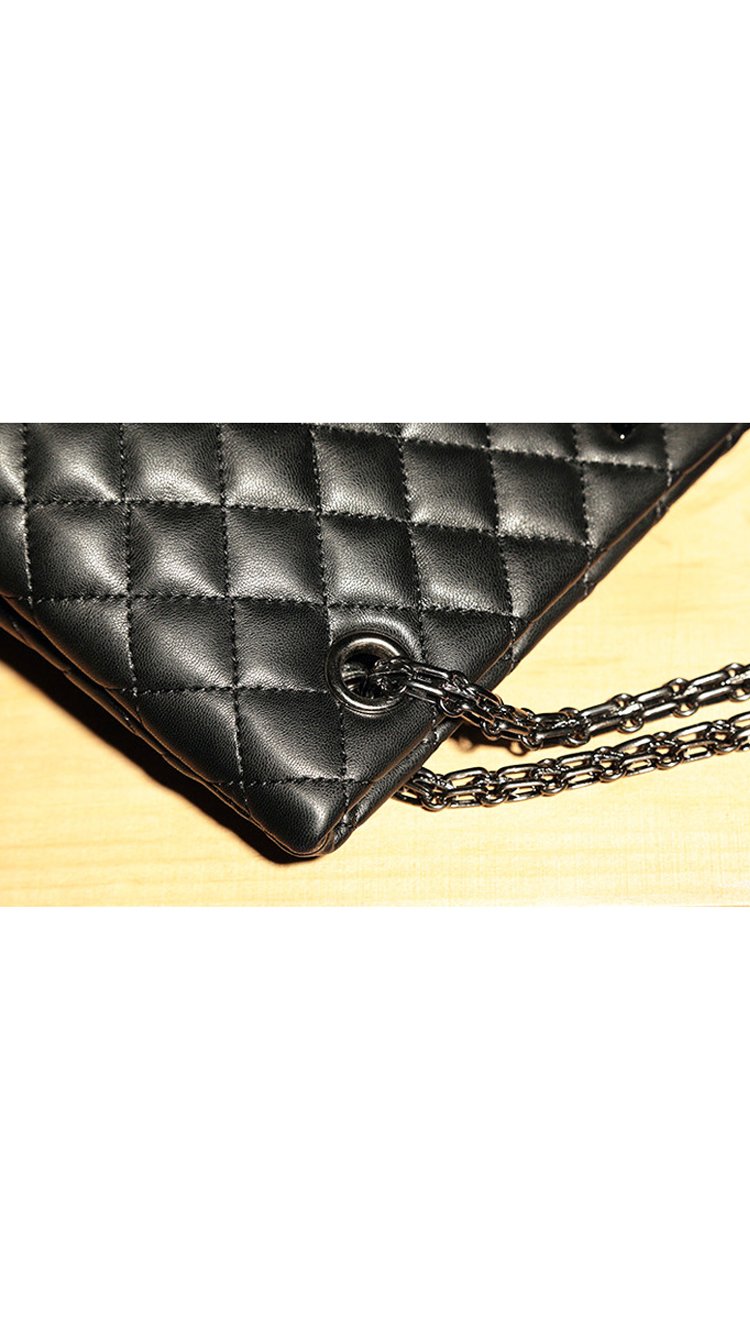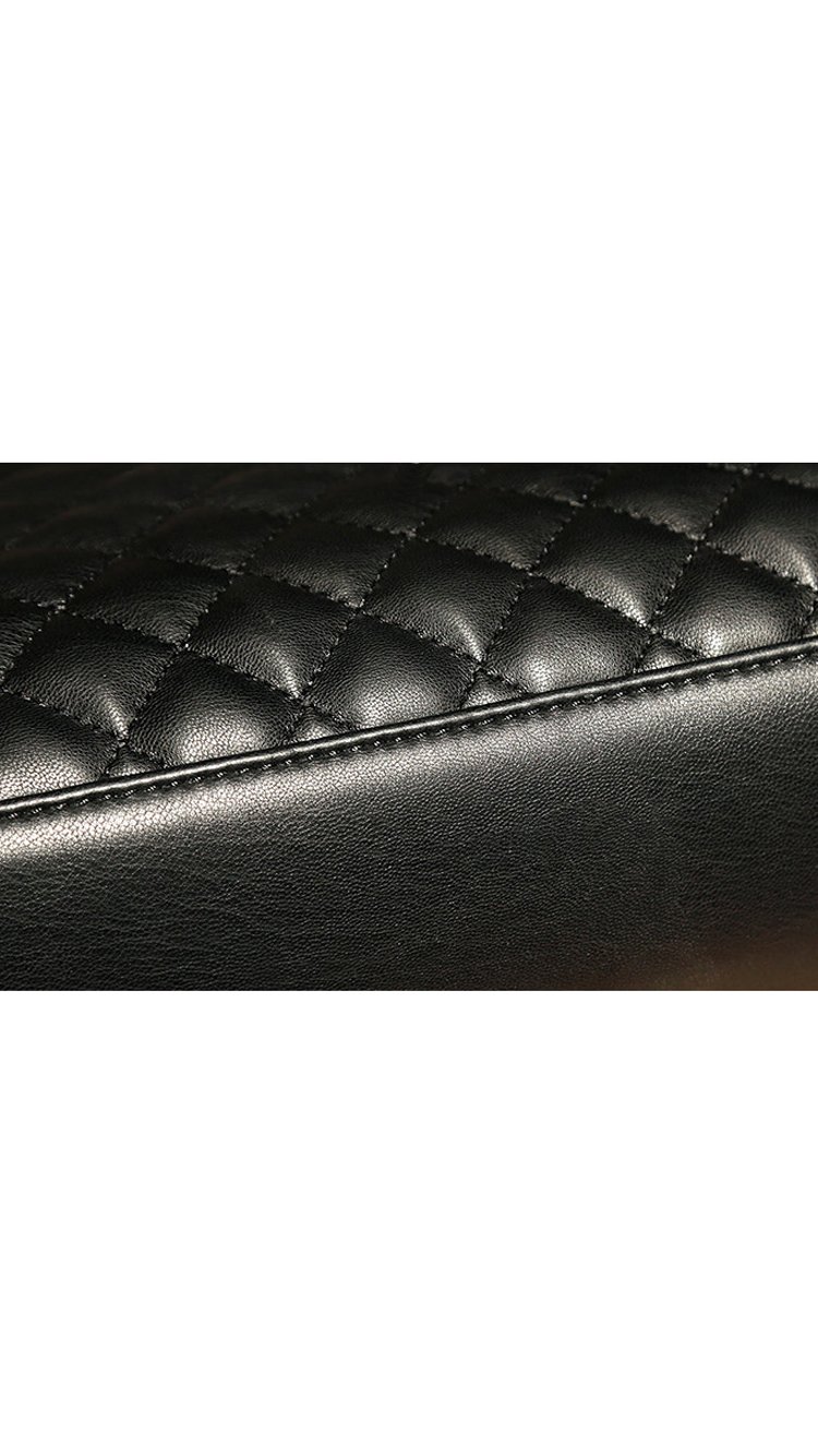Beautiful cross stitching compliments the supple black authentic split leather. Two ornate metallic shoulder straps are attached through two symmetrical openings and are reinforced with all metal hardware. Inside, a silky interior reveals three large storage compartments. - 29cm x 23cm x 10cm