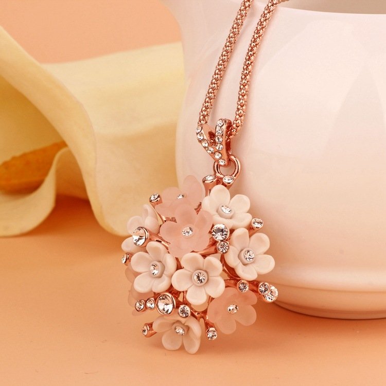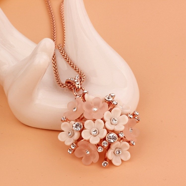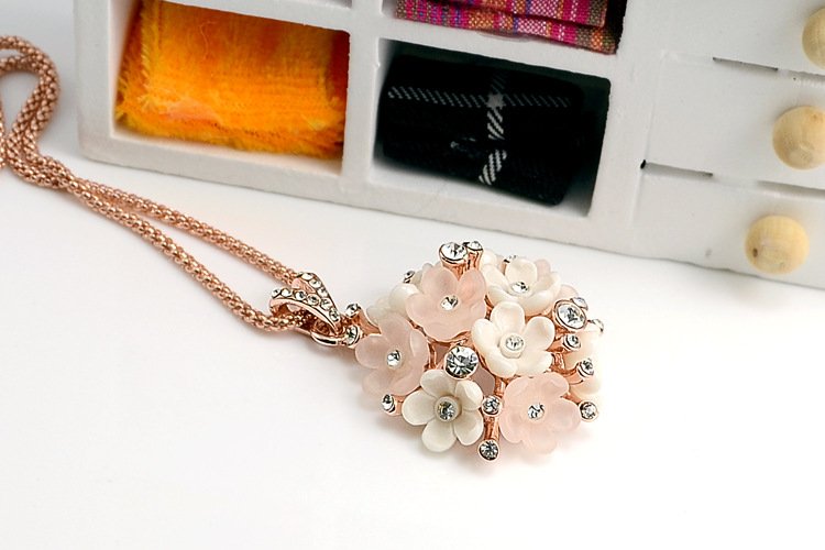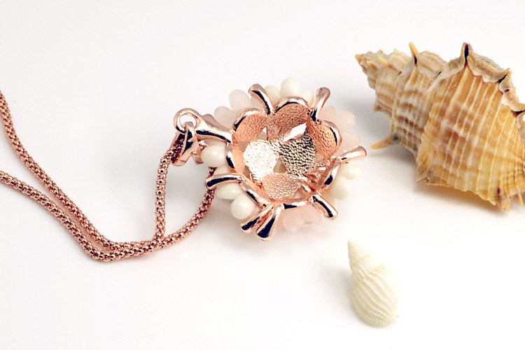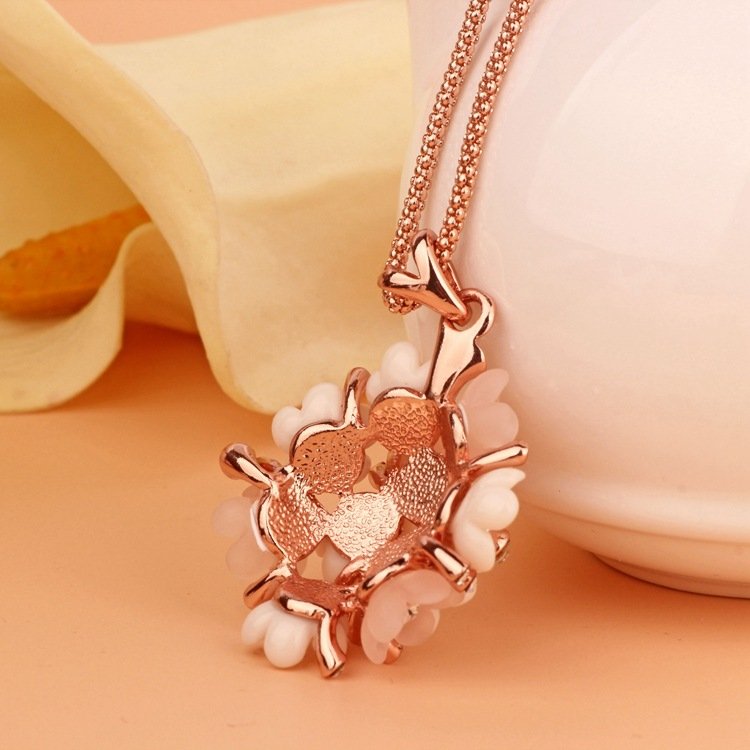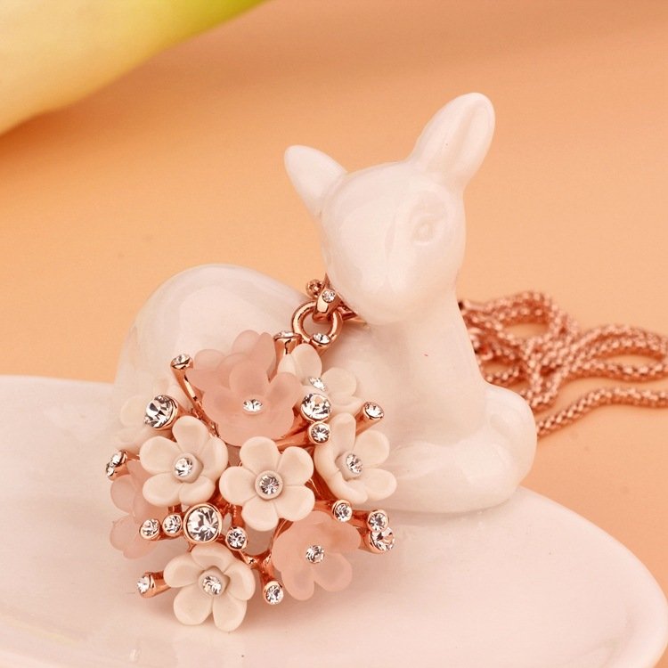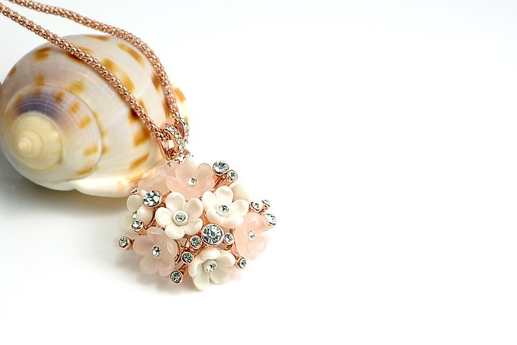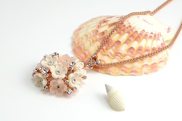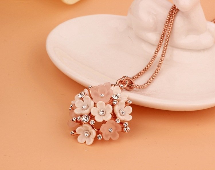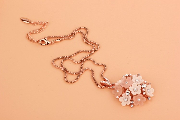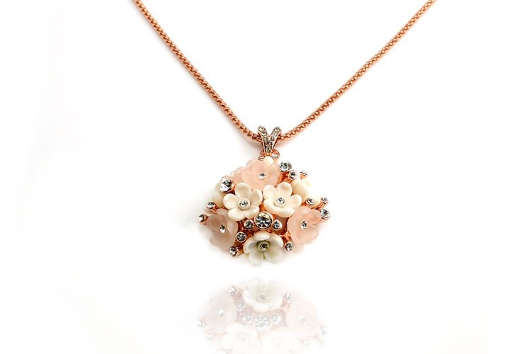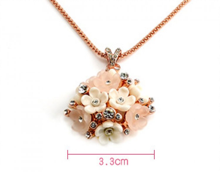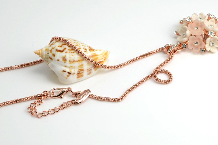 This exquisite piece pops with charm! Featuring 18k Rose Gold plating and fixed rhinestones, this is a positively dazzling piece! Pendant: 3.3 x 3.3 cm Length: 40 cm