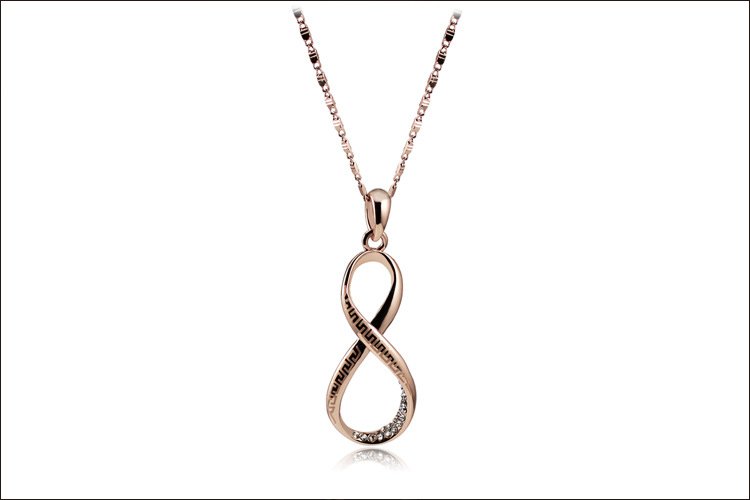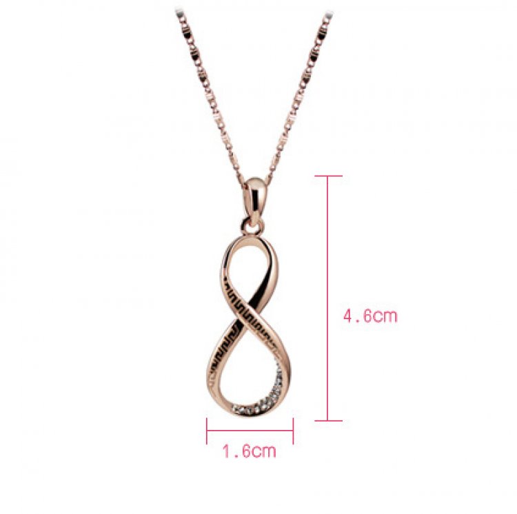 Show your love is for eternity with this striking showpiece. An 18k Rose gold plated 40cm long chain displays a 4.6cm long infinity symbol encrusted with tastefully placed, optically flawless man-made diamonds. The elegance and beauty of this piece is infinite, but our supplies are not, so order before they run out! Pendant: 1.6 x 4.6 cm Length: 40 cm