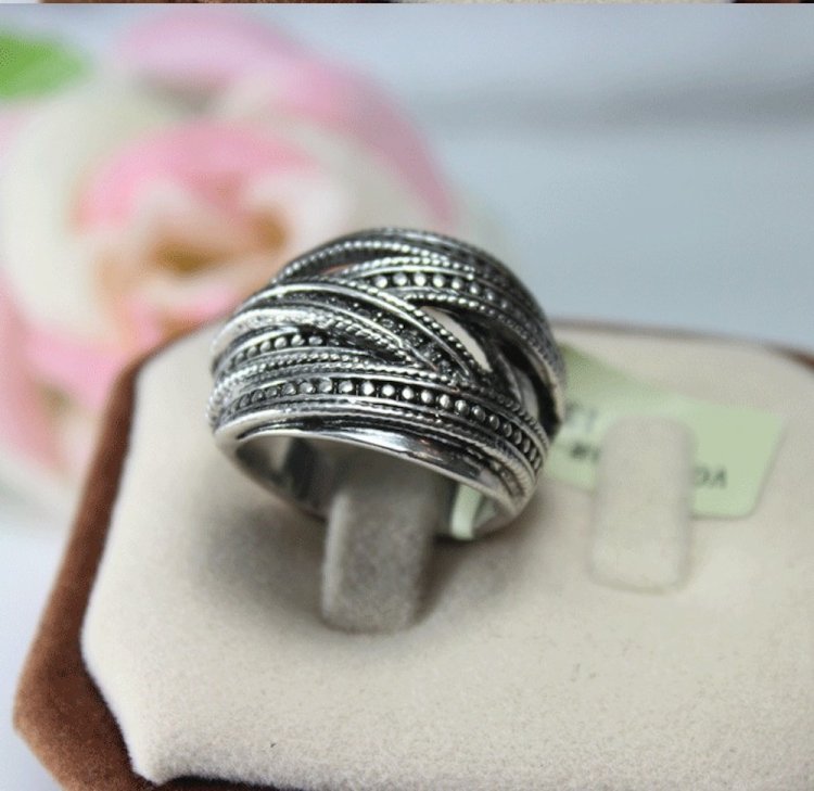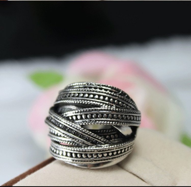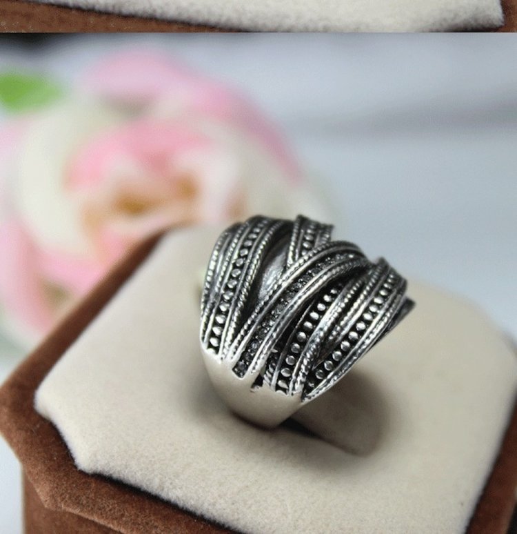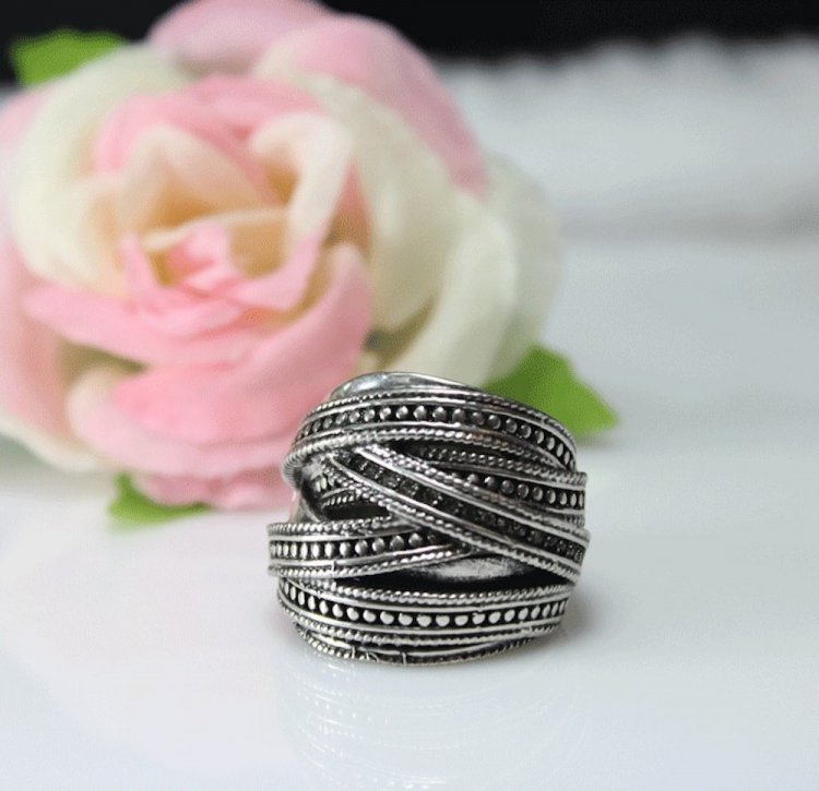 This is a true classic. Multiple overlapping etched rings of oxidized silver give this ring an aura of decisive retro magnificence. With a height of 2.5cm and available in sizes 6, 7, and 8.