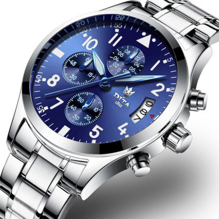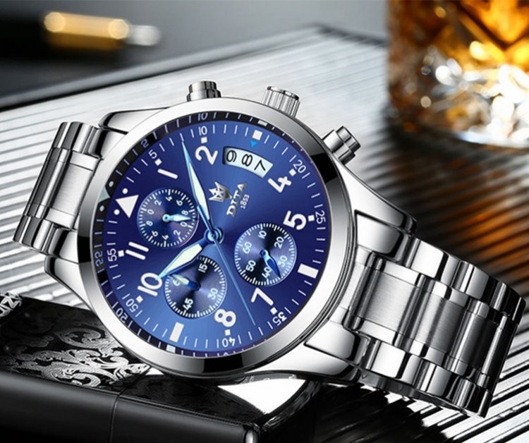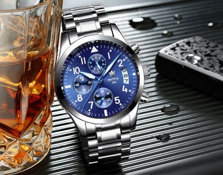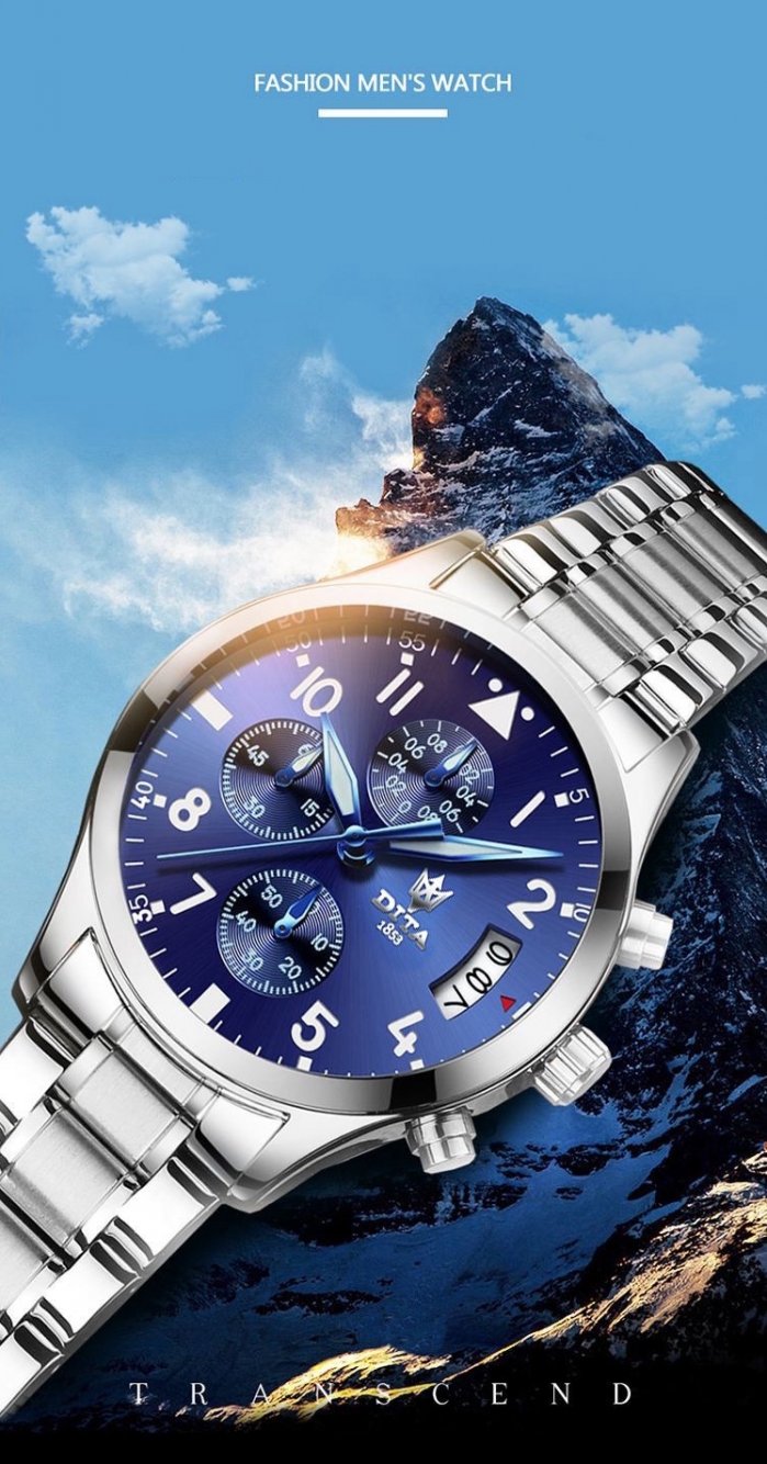 Equipped with precise quartz movement, the DITA Deep Blue Stainless Steel Chronograph Men’s Watch immediately makes itself known as the timepiece at the zenith of robustness, functionality and style. The case is water-resistant to 200m and features a polished finish, creating a striking contrast with the satin-brushed bezel and inner bracelet. Since 1853, DITA has been a specialist in technical watches. All chronograph parts are crafted in DITA’s own workshops, and DITA remains one of Asia's premier watchmakers. Brand: Dita Gender: Men's Shape: Round Clasp: Push Button Dial Plate Thickness: 11mm Model: SPD05 Display: Analog Water Resistance Rating: 30m Type of Caseback: Normal Dial Plate Diameter: 41mm Case Material: Stainless Steel Alloy Mirror Dial Material: Coated Glass Movement: Quartz Watchband Material: Stainless steel Watchband Width: 20mm Additional Features: Calendar, Small-second Type of Crown: Normal